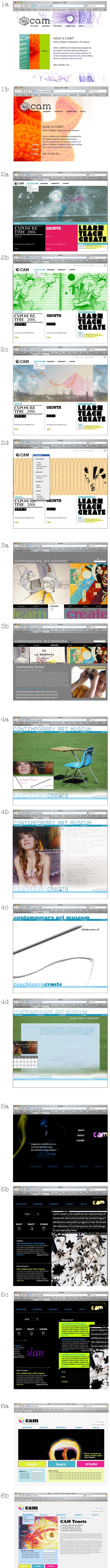 In general. I say lose the CAM cube thing...does not work for me. CAM or cam. Need consistency. I think that caps look cleaner, more straightforward. Worried l.c. could be cute...also get lost in text, but agree w/Denise that the font will define. Also agree other fonts should be considered. Felt disappointment in the type in many cases. Also do headings have to be so small? Always consider readability. In general, we need a system that works in several variations. Hip, cool (I know that dates me but can't see "gangsta" as suitable here) Need some play, some surprise; diversity w/in system but an overall consistency and very INTENTIONAL effects. Large white areas seem to simply drop out of design. But pastel or transparent colors juxtaposed to black, strong color and white are very pleasing. Easier to read on soft color than white if large area. Liked the quotes abt. imagination or creativity that showed up more than once. Could see those changing out on some time frame. Overall,lots of good stuff going on here!